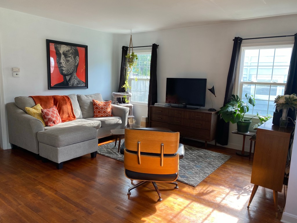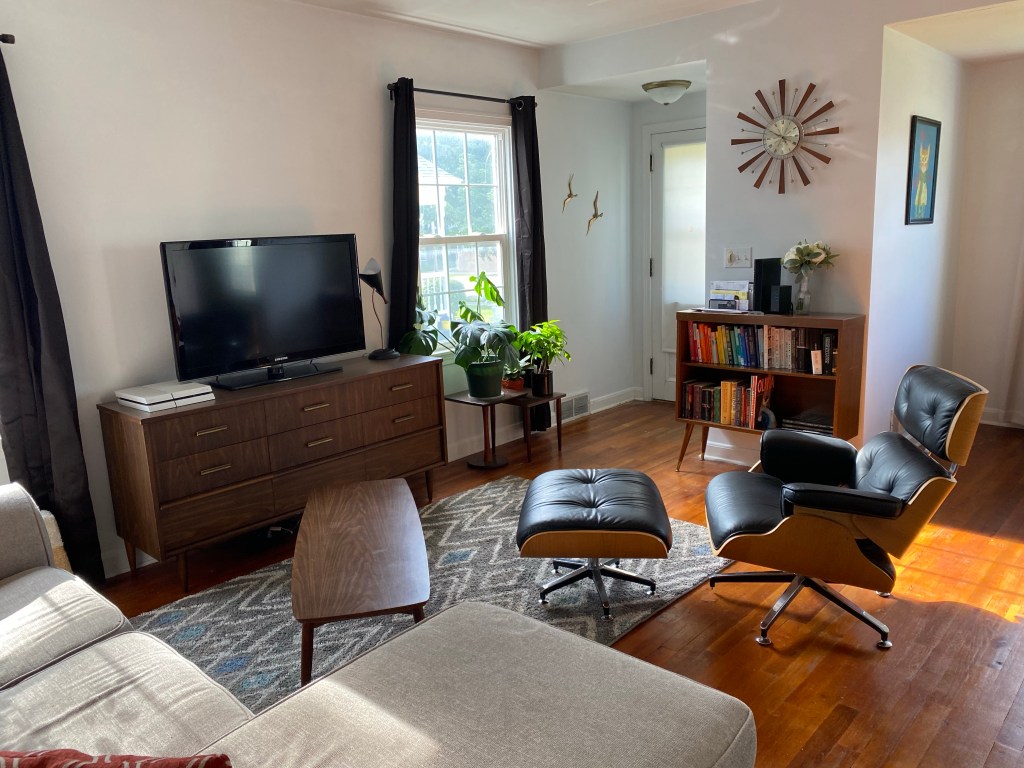 The floors always photograph well, but in person, they’re covered in paint splatters, nail holes, and patches are missing stain completely. Also, that is not a real Eames chair, it’s a replica, but we still got a great deal on it! $70 at a garage sale!!